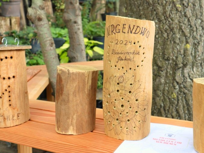 Naturnahe Strukturen in der Stadtnatur, wie z.B. abgestorbene Äste in Bäumen oder am Boden, finden sich im städtischen Grün selten. Dieses vermeintlich „tote Holz „ist jedoch äusserst wichtig für Kleinstlebewesen, Mikroorganismen und Insekten. Auch Wildbienen profitieren von dem Kreislauf des verwitternden Holzes in Bäumen oder am Boden. Da einige Wildbienenarten ihre Eier in „totem Holz“ ablegen, können wir die Artenvielfalt fördern und unterstützen, indem wir für Wildbienen Totholz bereitstellen und dieses vorab mit Bohrlöchern versehen.