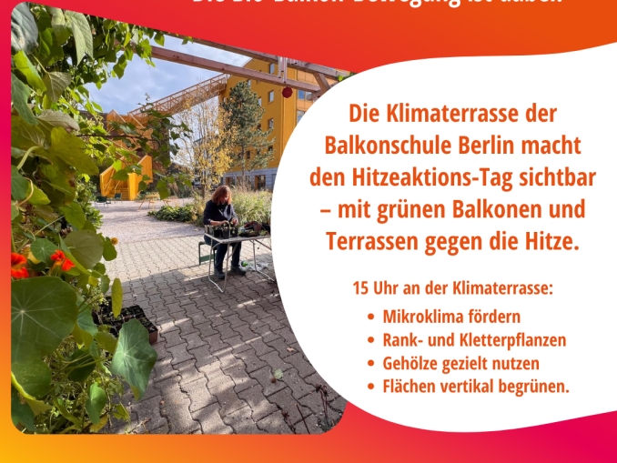 Die Klimaterrasse der Balkonschule Berlin macht den Hitzeaktions-Tag sichtbar – mit grünen Balkonen und Terrassen gegen die Hitze.